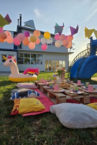 Vrtić poseduje prostrano dvorište sa zelenom površinom i spravama za igru, gde deca svakodnevno borave, trče i istražuju.
